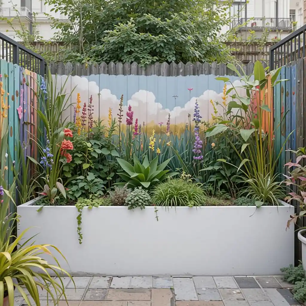 Brighten up the garden visually with a colorful painted fence or mural. It adds personality and a sense of depth to tiny spaces.