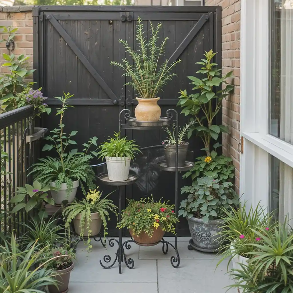 Add height variation and dimension with tiered plant stands. These stands help display more plants in less space while creating an eye-catching focal point for balconies and patios. Small Garden Ideas