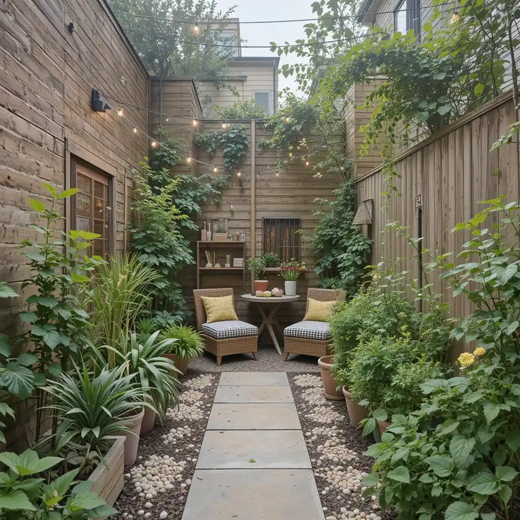 Add warmth and charm by hanging string lights overhead. Lighting instantly makes even the smallest garden feel cozy and ready for evening relaxation. Small Garden Ideas