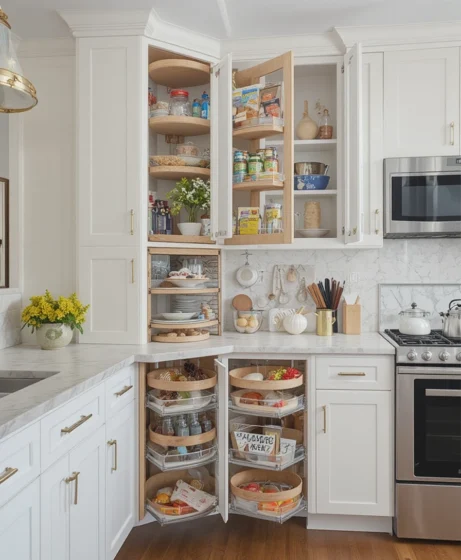 Corner cabinets with pull-out shelves prevent wasted space. These solutions make hard-to-reach areas usable. Efficient corner storage improves organization.