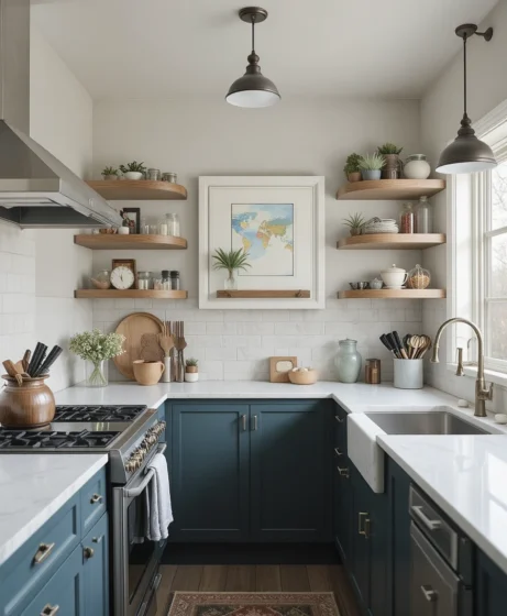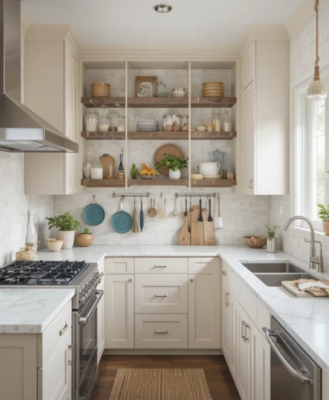 Open shelves remove heaviness from small kitchens. They allow light to move freely and keep the space visually open. When styled neatly, open shelving adds charm and easy access.