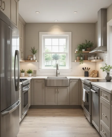Neutral colors create a calm and balanced look. Beige, gray, and soft white tones keep the kitchen visually uncluttered. This palette also makes resale easier.