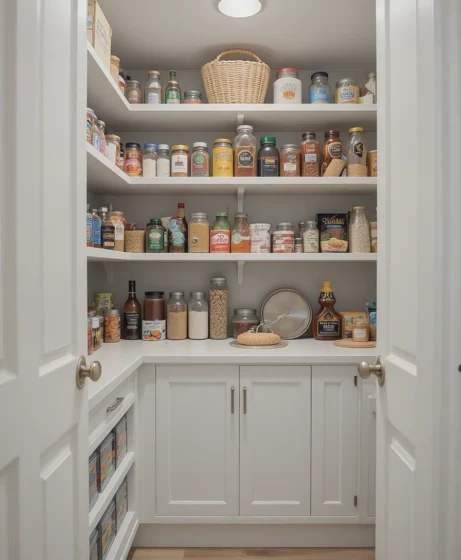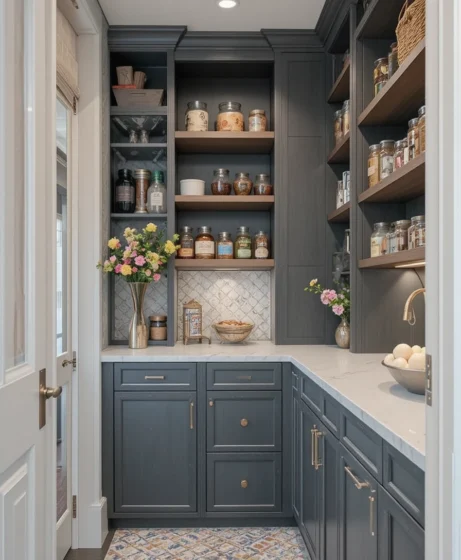 Floating shelves work perfectly for narrow or unused wall areas. They keep everyday essentials accessible while adding a modern decorative touch to the pantry.