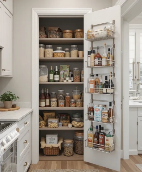 Use the inside of the pantry door for added storage. Door-mounted racks hold spices, condiments, wraps, and oils while freeing up shelf space for larger items.