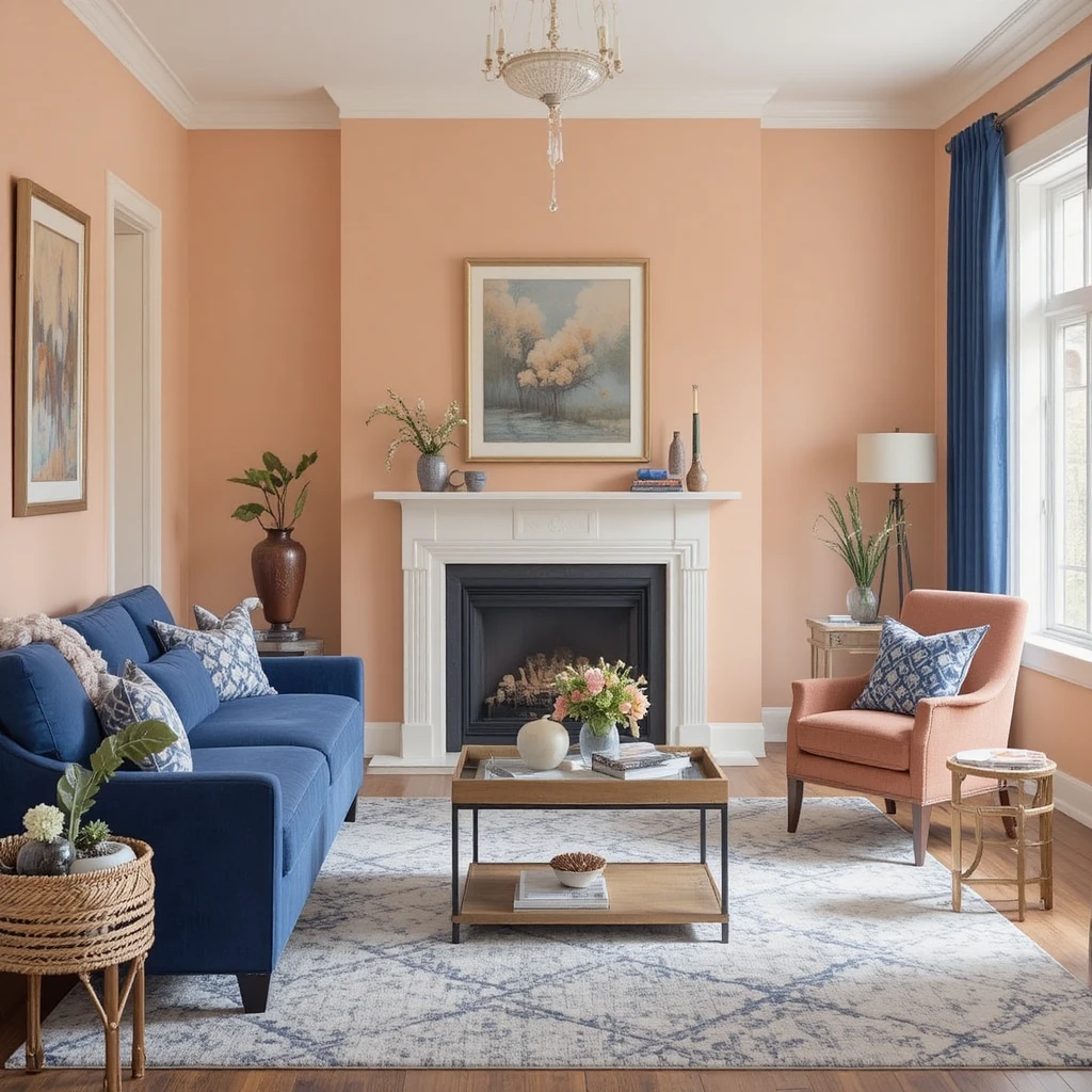 Soft peach walls look stunning with navy blue accents. Use this combination for pillows, rugs, or an accent chair to create depth and visual interest.