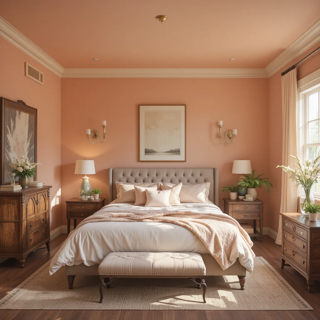 Dusty peach walls evoke nostalgia and charm. Ideal for vintage-inspired bedrooms or sitting areas, it pairs well with antique furniture and muted accents. Soft Peach Paint Colors