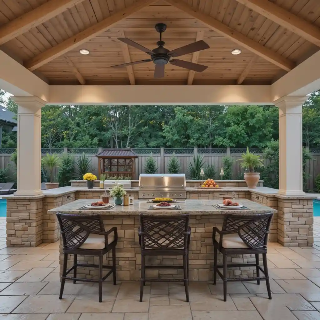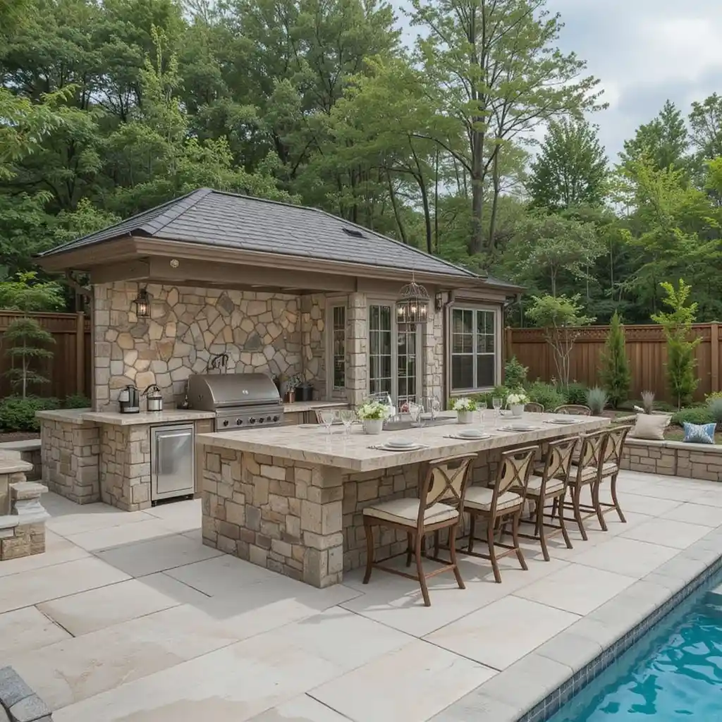 Build your kitchen using the same stone or pavers as your pool area for a cohesive and luxurious backyard design.