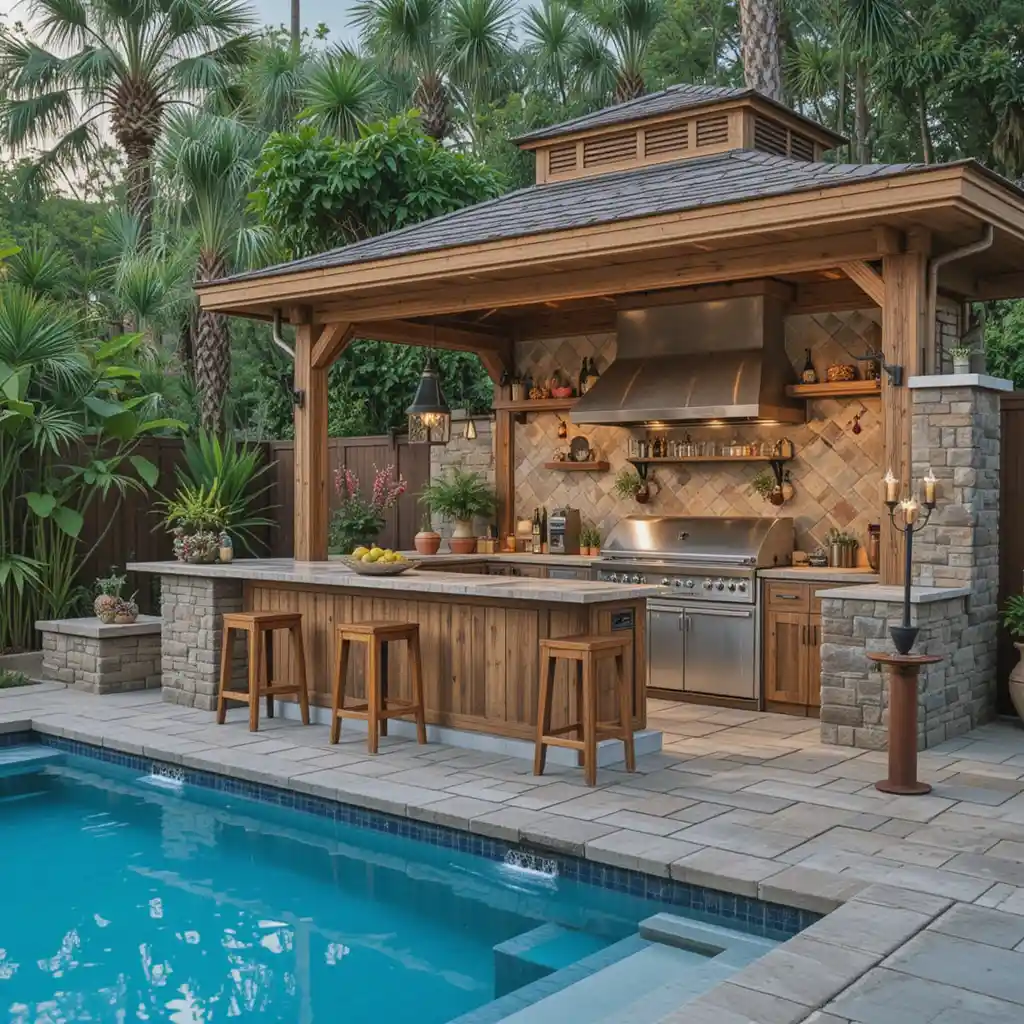 Use bamboo finishes, tiki torches, and tropical plants to transform your kitchen into a Caribbean-style escape that complements the pool vibe.