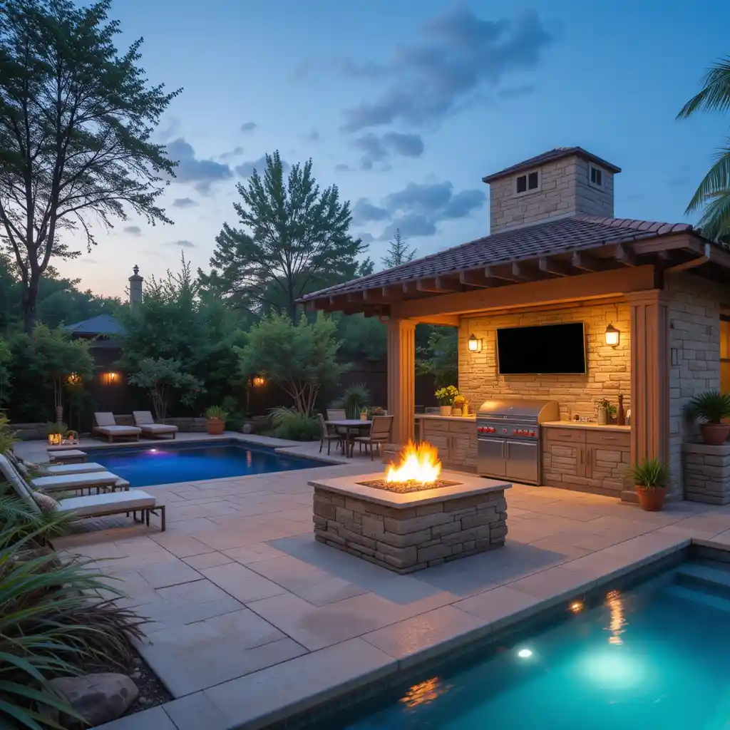 Include a built-in fire pit or fireplace near your kitchen and pool area to provide warmth and ambiance for nighttime entertaining.