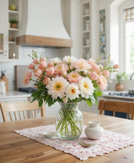 Nothing says spring like fresh flowers. Place a vase of tulips, daisies, or peonies on your kitchen island or dining table. Spring kitchen decor with real blooms adds color and a refreshing scent. Choose pastel shades to create a soft seasonal vibe that feels welcoming and lively.