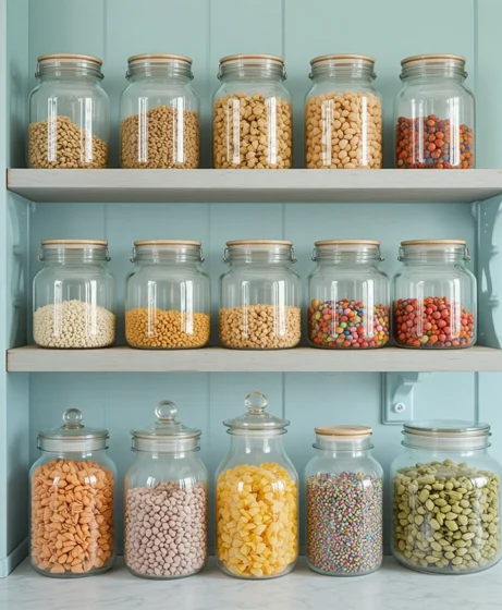 Fill clear jars with colorful pasta, lentils, or candies. Display them neatly on countertops or shelves. This creative spring kitchen decor idea adds visual interest while keeping essentials accessible.