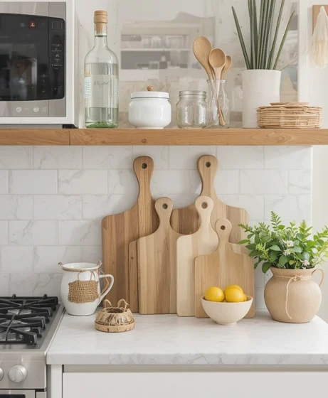 Lean light wooden cutting boards against your backsplash. Their natural tone complements spring decor perfectly. Spring kitchen decor using wood accents keeps the space warm and inviting.