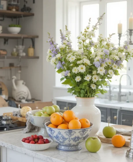 Display bowls filled with oranges, strawberries, or green apples. Fresh fruits not only look appealing but also promote healthy eating. This practical spring kitchen decor idea adds both beauty and function.