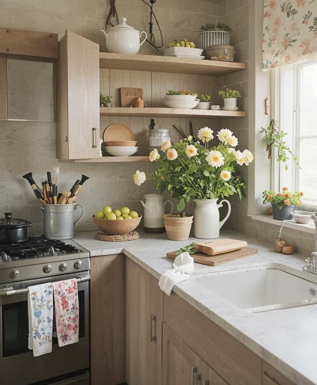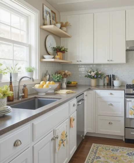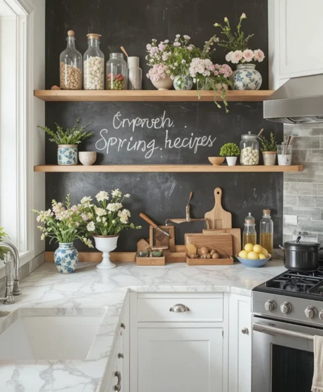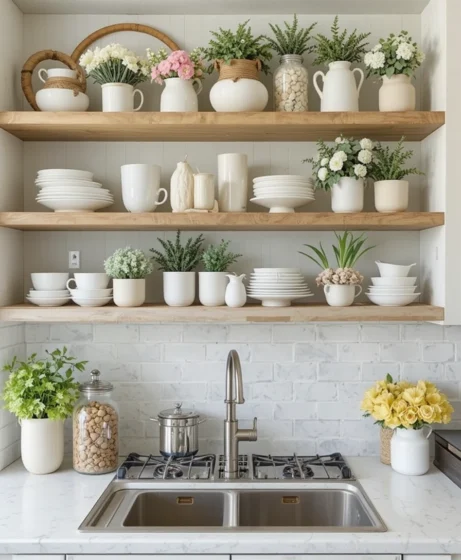 If you have open shelving, rearrange it with spring-themed pieces. Add small plants, pastel jars, and white ceramic items. Spring kitchen decor styling on shelves can transform the entire room without major changes.