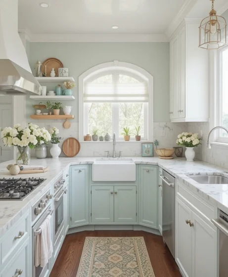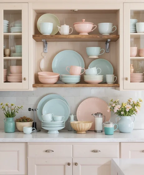 Swap out dark dishes for pastel plates, bowls, and mugs. Display them on open shelves or behind glass cabinets. This spring kitchen decor trend adds instant color without overwhelming the space and works beautifully in modern and farmhouse kitchens alike.