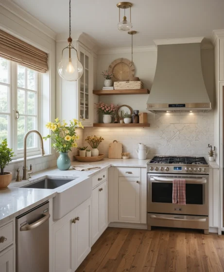 Upgrade lighting to soft warm bulbs or modern pendant fixtures. Good lighting enhances your entire kitchen atmosphere. Spring kitchen decor lighting ideas make the space feel brighter and more welcoming.