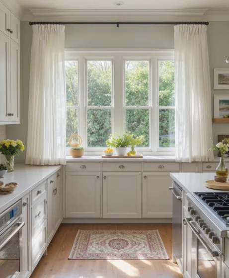 Replace heavy winter drapes with sheer white or soft pastel curtains. They allow more natural light to flow into your space, making your kitchen feel open and bright. Spring kitchen decor ideas like this are affordable yet impactful, especially for smaller kitchens.