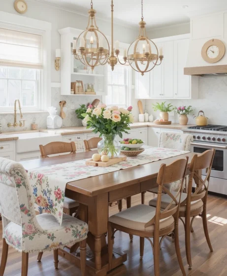 Replace heavy winter linens with a floral table runner. Choose subtle floral patterns for a modern look or bold prints for a farmhouse style. Spring kitchen decor updates like this instantly refresh your dining area.
