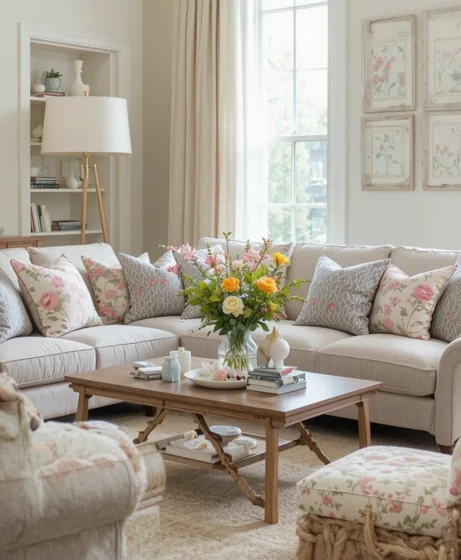 Swap heavy winter pillows for soft, spring-inspired throw pillows in pastel or floral patterns. This small change instantly adds color and comfort without overwhelming the Spring Living Room Decor.