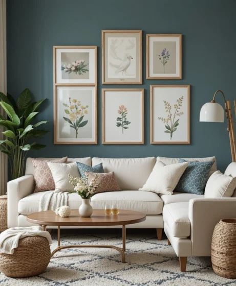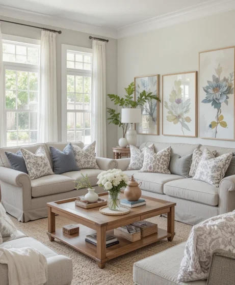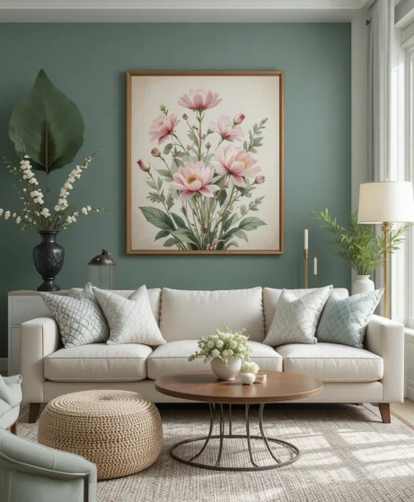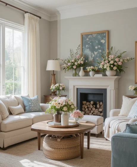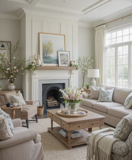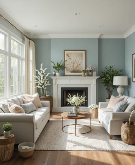 Introduce soft blues, sage green, blush, or warm neutrals. These colors reflect spring’s calm energy and help the living room feel lighter and more peaceful.