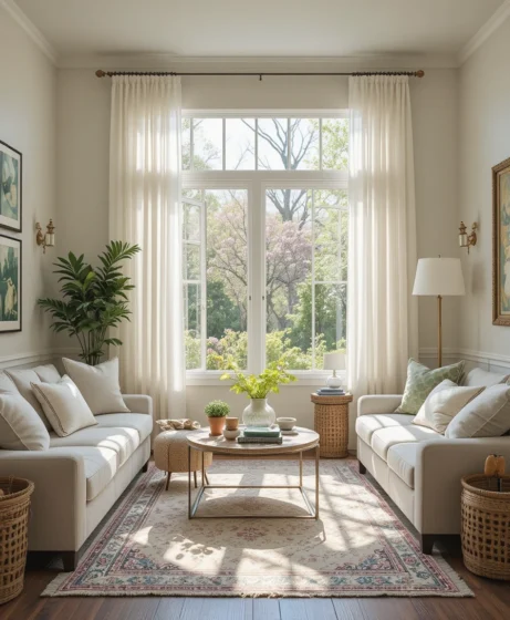Replace dark drapes with sheer or lightweight curtains. They allow more sunlight in, making your living room feel open, fresh, and perfectly suited for spring days.