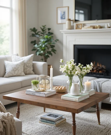Style your coffee table using spring-themed books, small vases, and candles. Keep it minimal to maintain a clean and relaxed look Spring Living Room Decor.