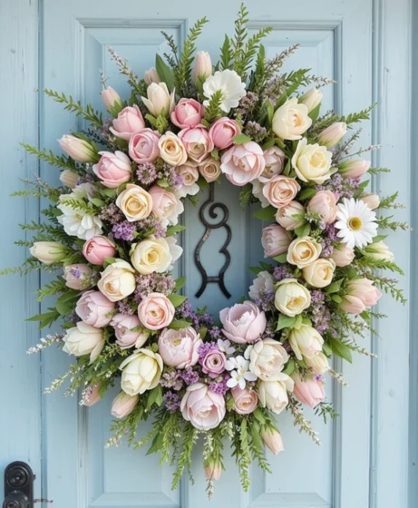 A timeless spring wreath front door featuring faux or fresh florals like tulips and daisies instantly feels cheerful. Soft colors and full blooms create a welcoming look that works with any home style Spring Wreath Front Door.