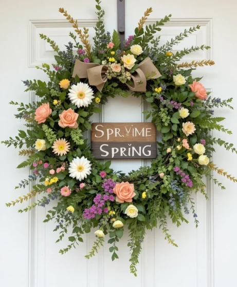 Incorporate small wooden signs or beads for added texture. This spring wreath front door idea blends natural elements beautifully for a warm, inviting entrance.