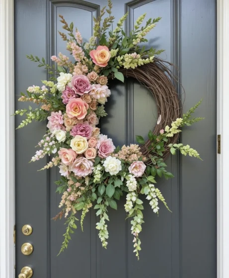 Adding trailing flowers or greenery creates movement and visual interest. This spring wreath front door idea feels dynamic and elegant Spring Wreath Front Door .