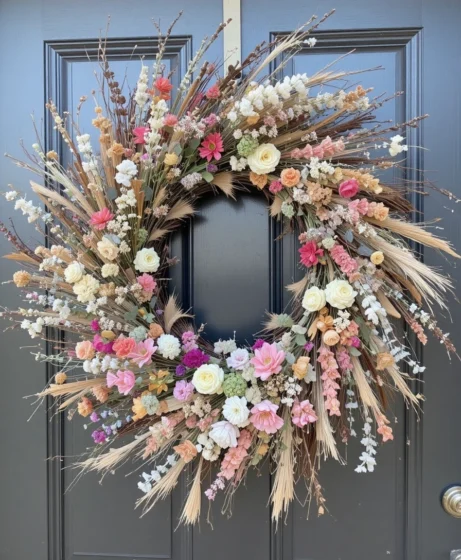 Loose, colorful wildflowers give the wreath a natural, garden-picked feel. This spring wreath front door style feels relaxed, joyful, and full of seasonal personality.