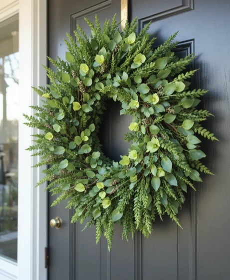A wreath made entirely of lush greenery offers a clean and refreshing entrance. This spring wreath front door idea feels natural, calm, and perfect for homeowners who prefer subtle elegance.