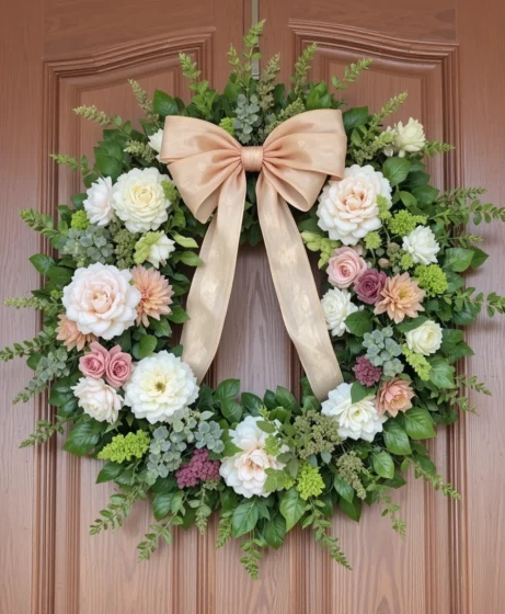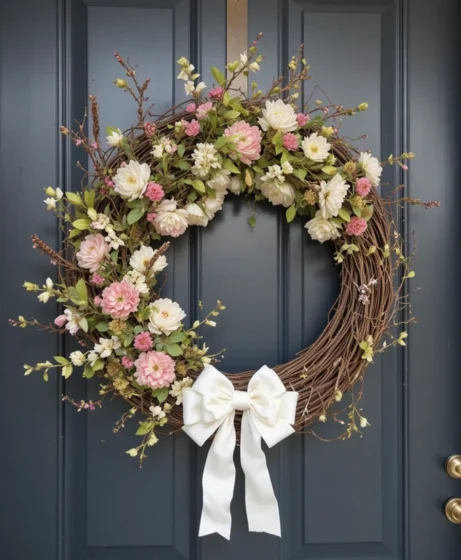 Adding a soft ribbon in pastel or neutral tones brings movement and charm. This spring wreath front door idea adds elegance without making the design feel busy.
