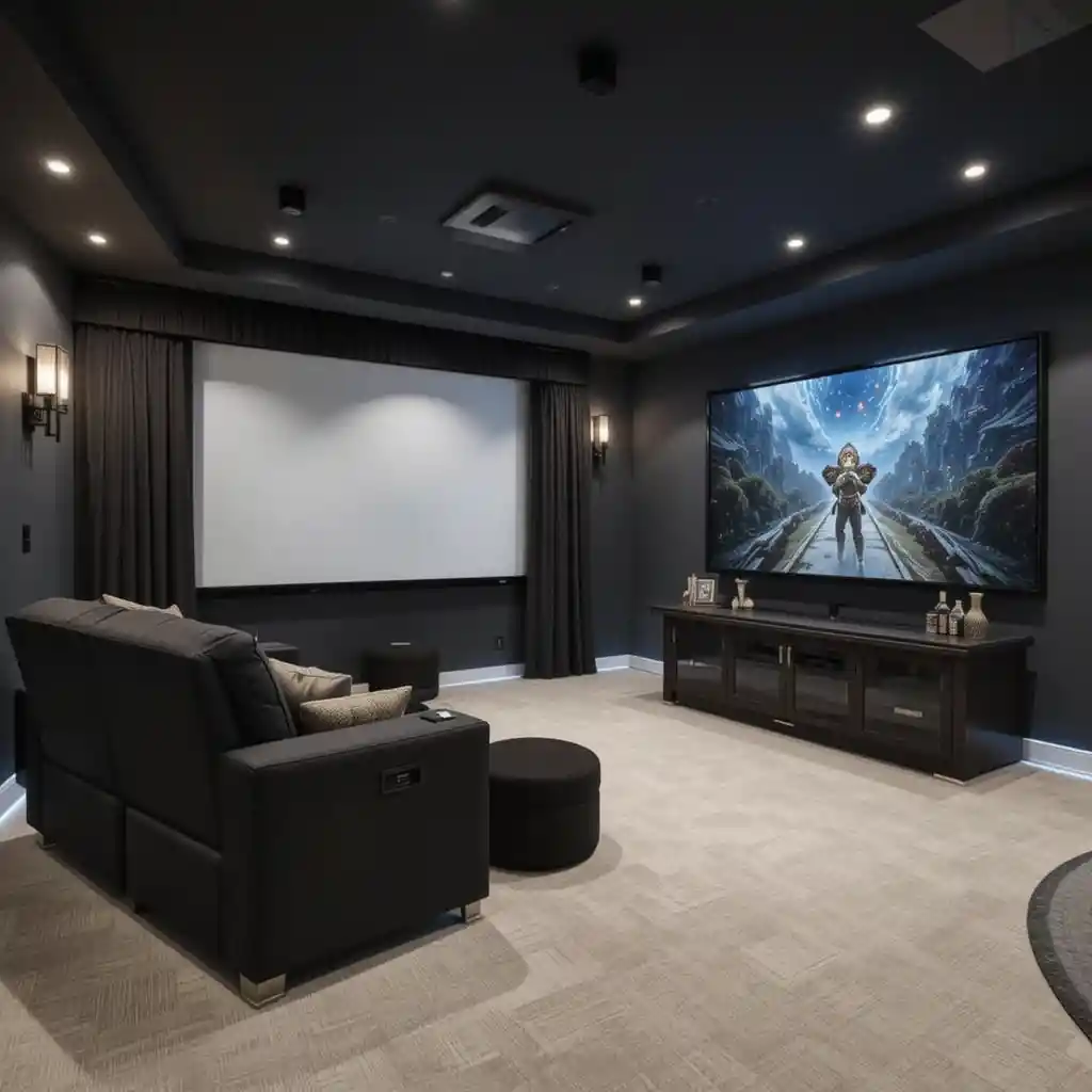 Transform your basement into a mini home cinema with blackout curtains, plush seating, and a projector screen. Add LED lighting around the baseboards for an immersive movie experience.