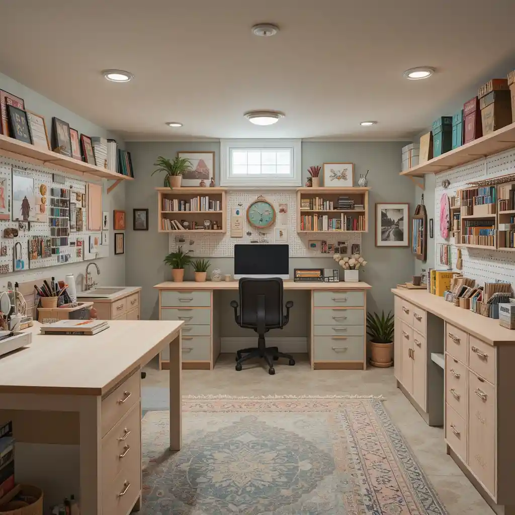 Set up a creative space with ample table space, labeled drawers, and pegboards. Use pastel colors and good lighting to keep things cheerful.