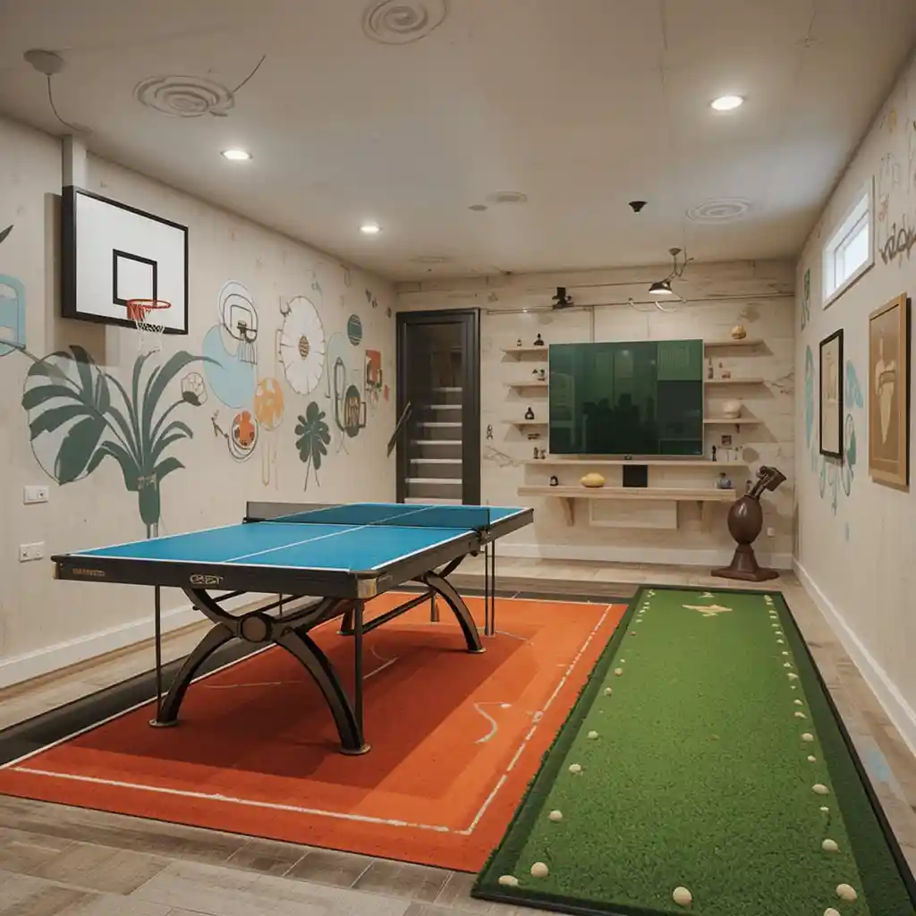 Add a mini basketball hoop, ping pong table, or putting green to keep the whole family active indoors. Use wall decals and floor lines for extra flair. Stylish Basement Ideas