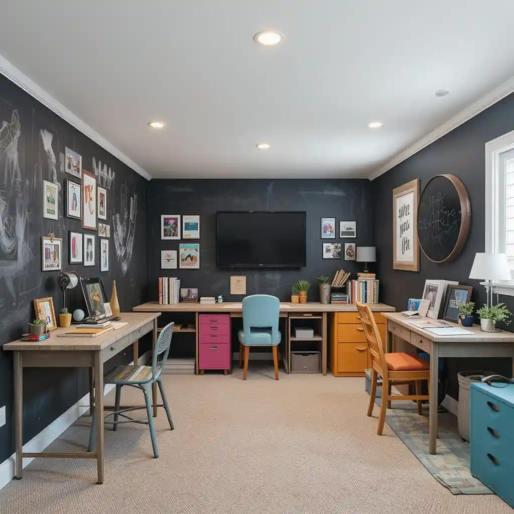 Set up a kid-friendly learning space with chalkboard paint walls, desks, and colorful organization. Keep materials close and seating comfy. Stylish Basement Ideas