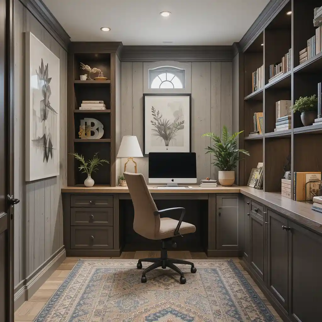Design a quiet work-from-home zone with a minimalist desk, ergonomic chair, and built-in shelves. Use soundproof panels to ensure a distraction-free workspace.