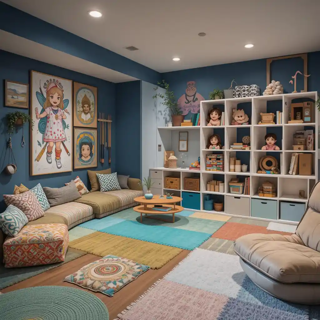 Create a colorful and safe playroom with soft mats, wall art, and cubby storage. Keep the design flexible to grow with your kids’ needs.