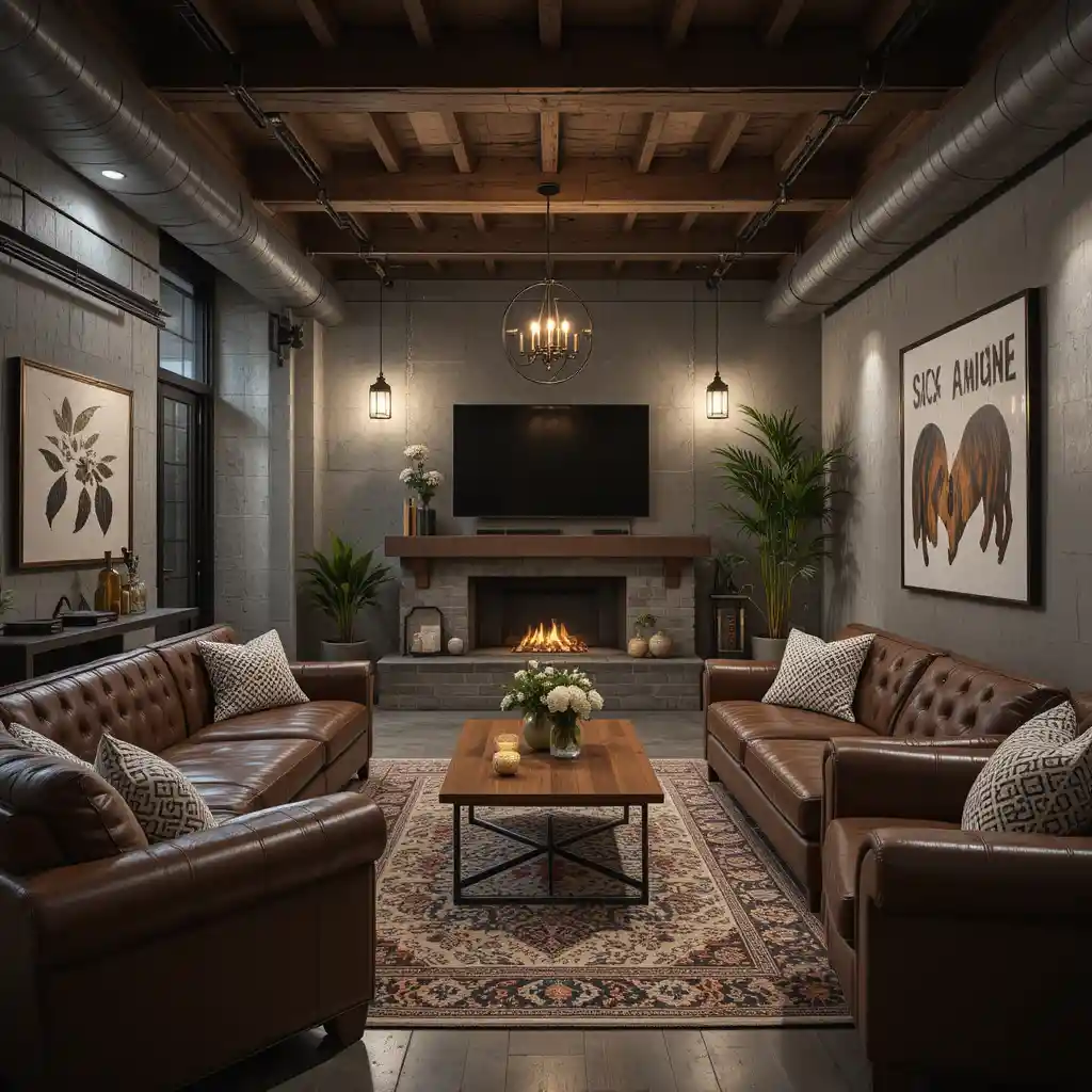 Use reclaimed wood, cozy textiles, and ambient lighting for a rustic basement escape. Add a faux fireplace for extra charm and comfort.