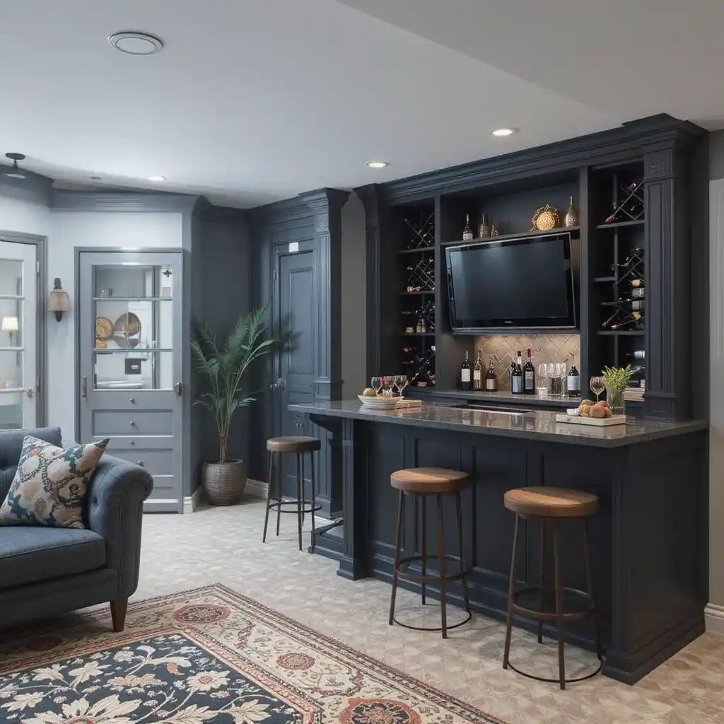 Install a sleek built-in bar with stools and wine storage for casual entertaining. Use moody tones like navy or charcoal for a classy finish.