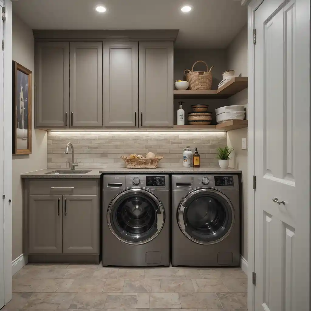 Upgrade your laundry space with stacked machines, custom cabinetry, and backsplash tile. Add floating shelves for detergents and storage baskets.