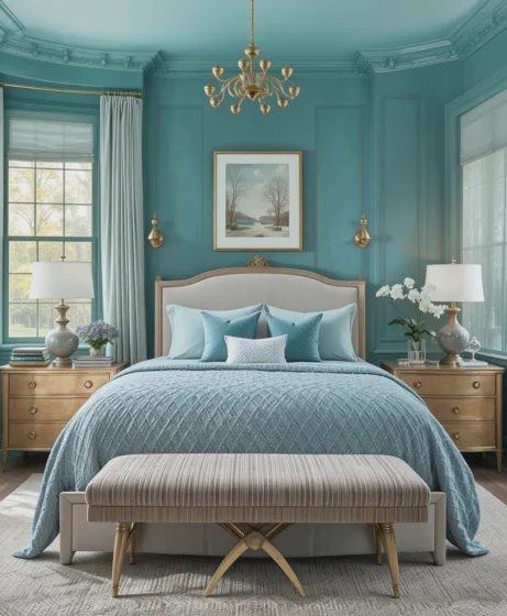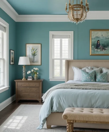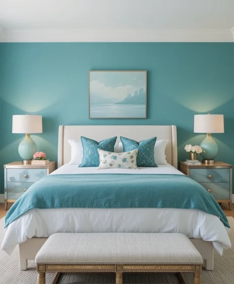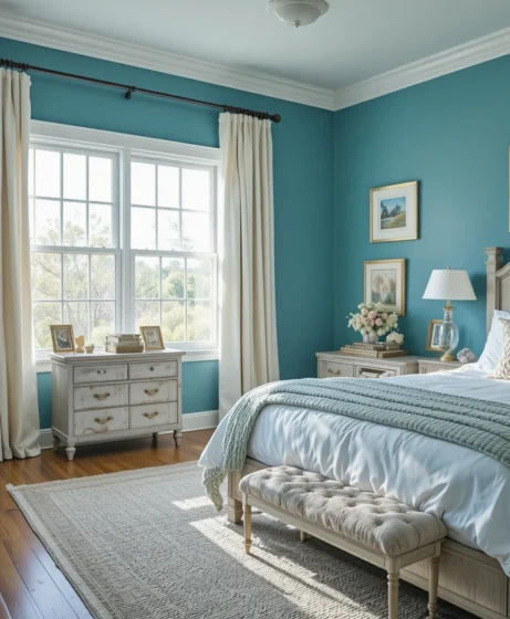 A classic teal wall color paired with crisp white trims creates an elegant balance of contrast. This combination keeps your bedroom bright while giving it a modern, coastal-inspired look that feels fresh and inviting Teal Blue Bedroom.