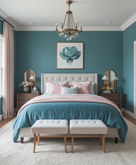 Pair teal blue with blush pink for a romantic yet trendy combination. The soft pink accents tone down the richness of teal, creating a balanced and stylish feminine touch Teal Blue Bedroom.