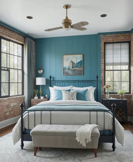 Mix teal walls with metallic fixtures, exposed brick, and black iron accents for an industrial twist. The cool teal hue softens the raw textures, making your space look modern yet welcoming Teal Blue Bedroom.