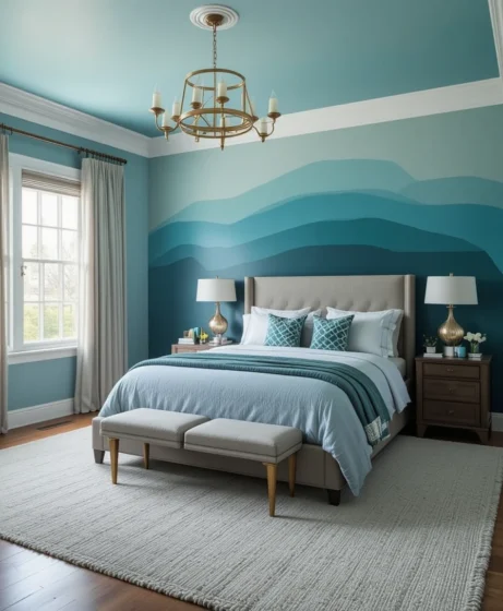 Create visual depth with ombre-painted teal walls, blending lighter shades near the ceiling and darker tones near the floor. This technique adds dimension and a stunning artistic feel.