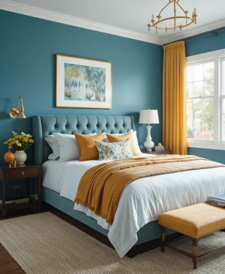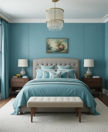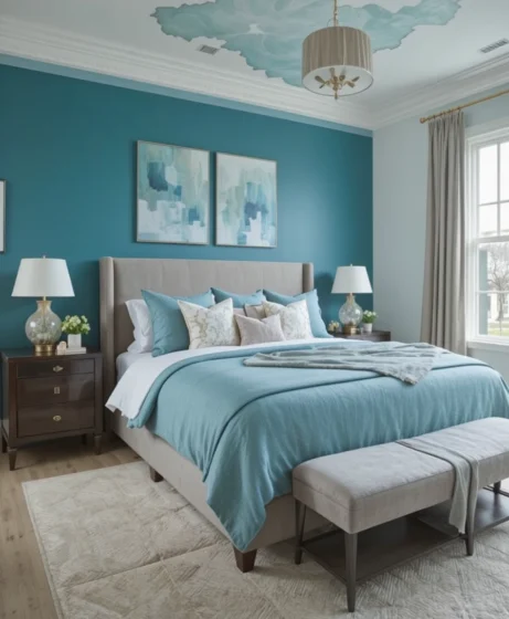 Combine teal blue and soft gray tones for a serene and balanced atmosphere. This pairing works well for master bedrooms, bringing a sense of calm sophistication that’s ideal for relaxation.