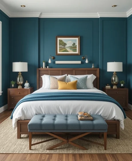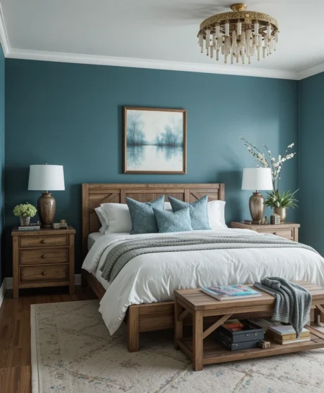 Deep teal walls paired with warm wooden tones create a cozy and earthy space. This combination feels grounded and sophisticated, ideal for bedrooms that need warmth and depth Teal Blue Bedroom.