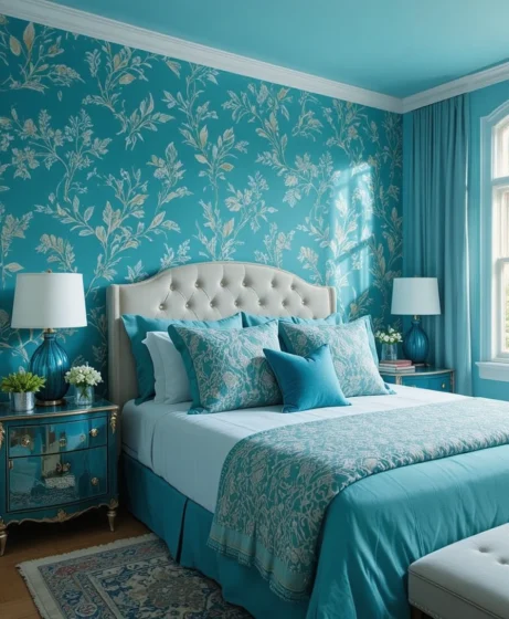 If you prefer patterns, choose teal floral or geometric wallpaper to make a statement. It’s perfect for accent walls behind the bed, adding texture and artistic flair to the room.