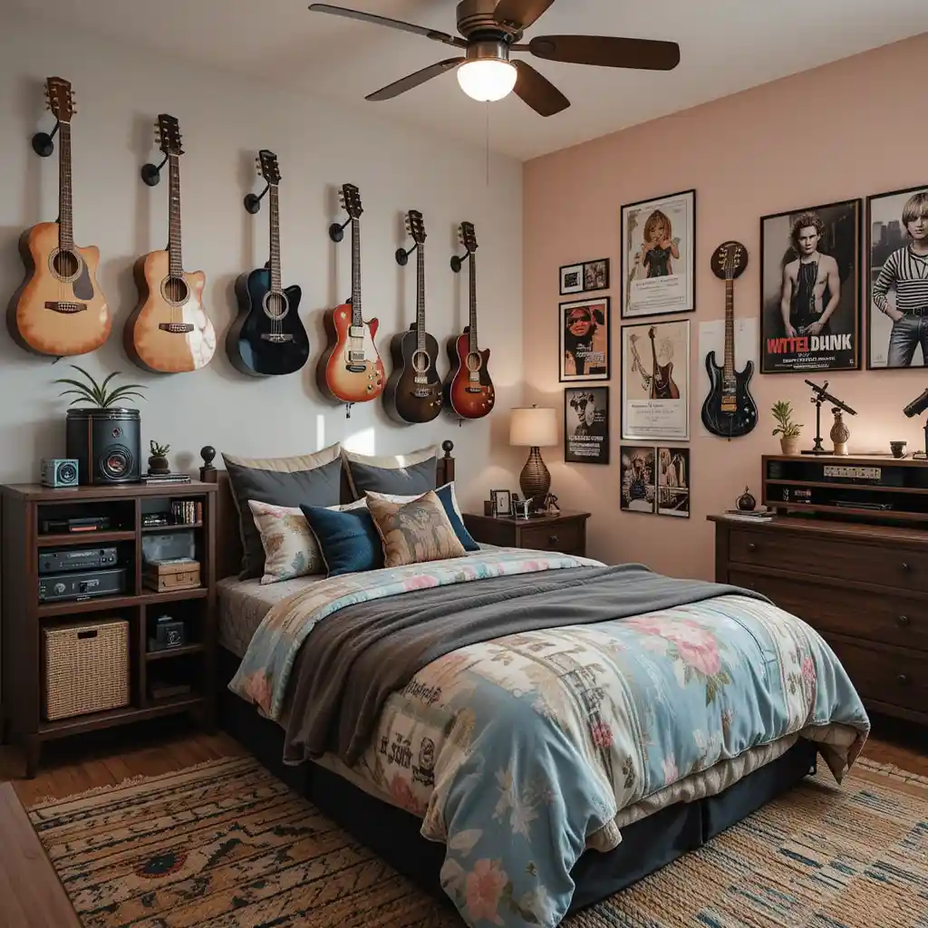Hang guitar wall mounts, record players, and music posters for a personalized vibe. Teens passionate about music will enjoy having their bedroom double as a creative retreat.