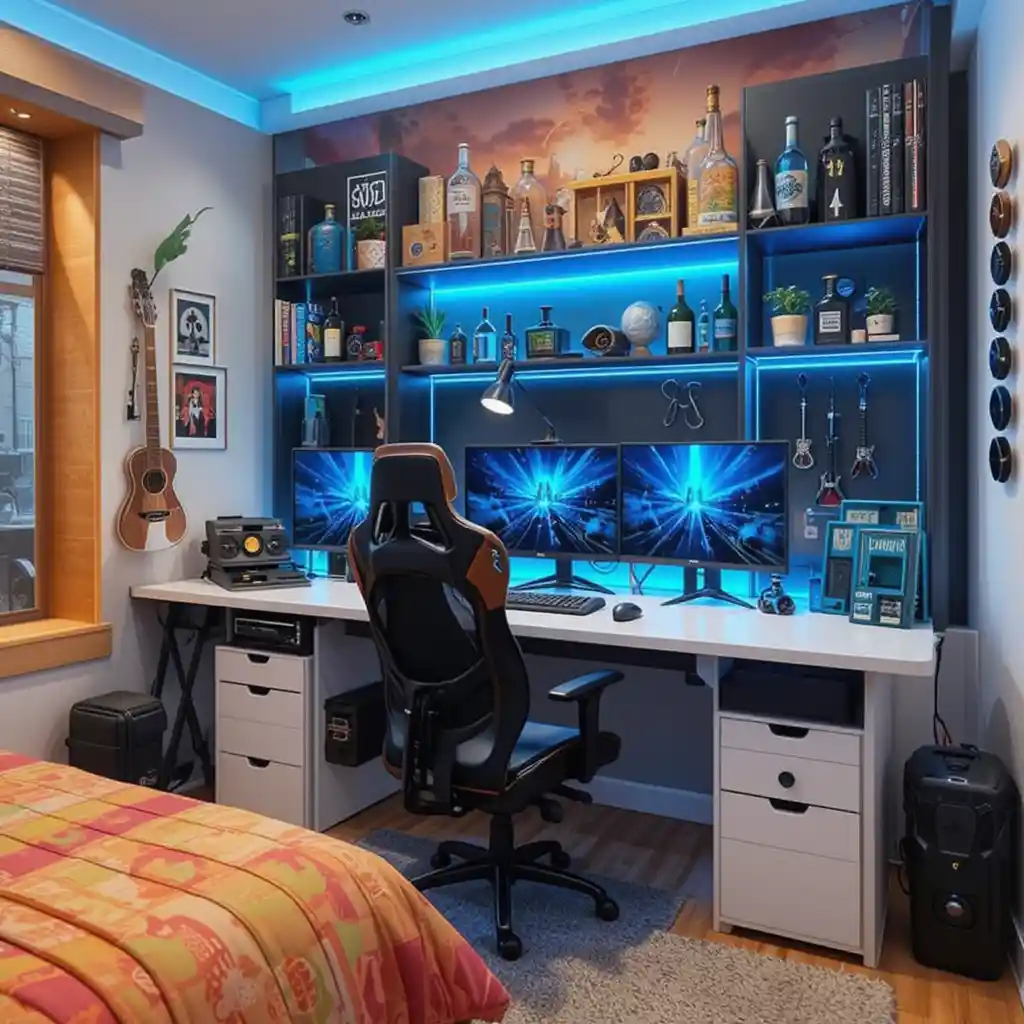 For gamers, a stylish desk with LED monitors, gaming chairs, and themed décor is essential. It creates a personalized entertainment hub while staying organized.